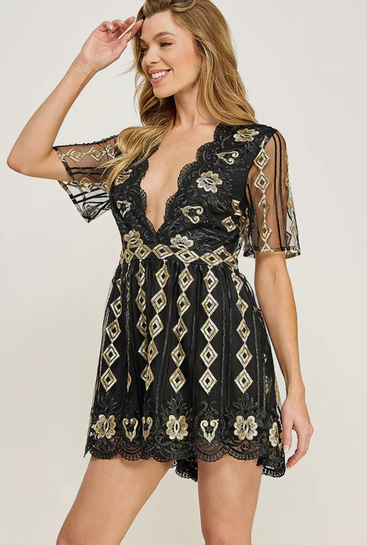 Va Va Voom Black & Gold Embroidered Romper