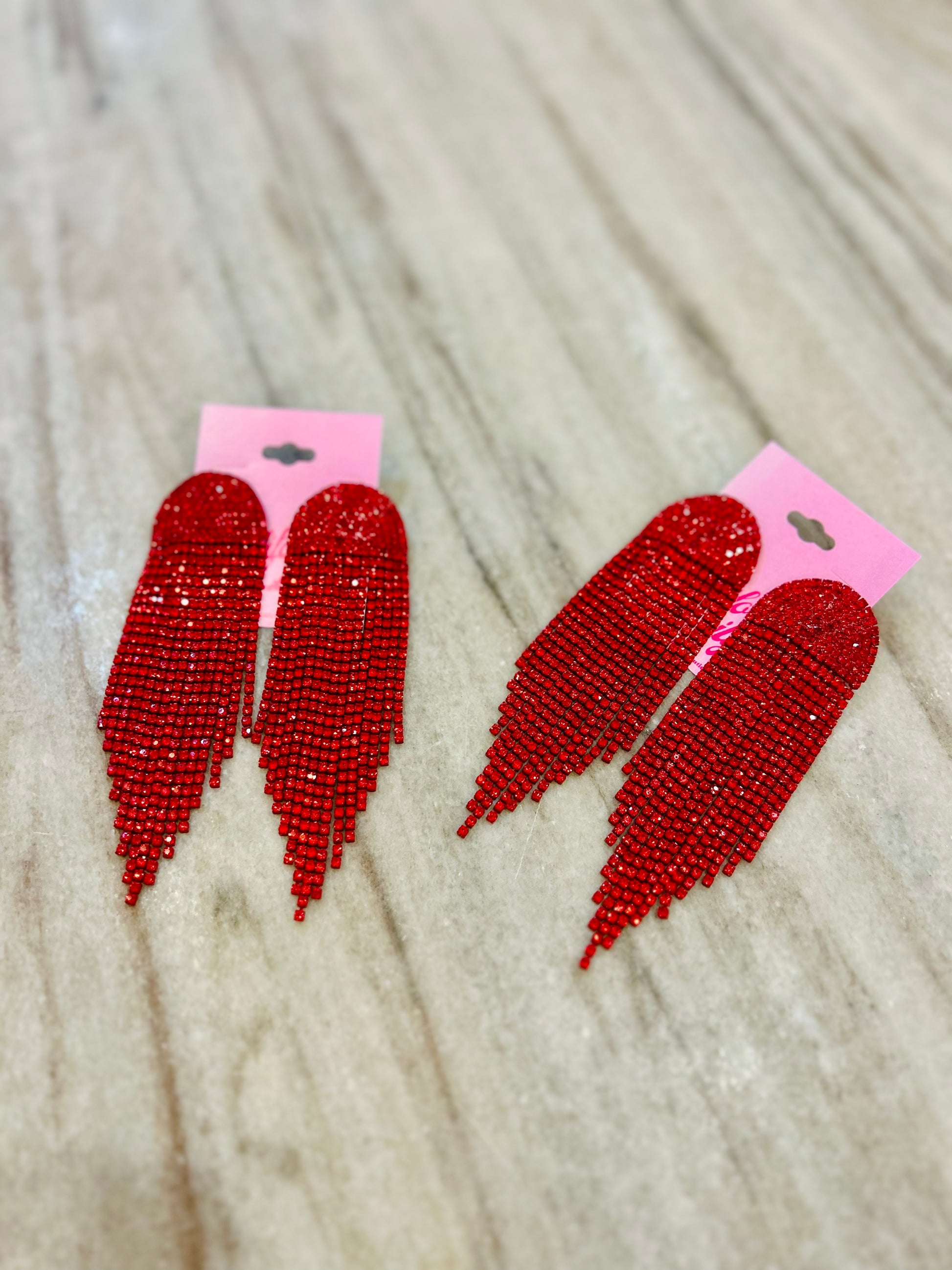 Turn every head in the room with our Boomer Bling Fringe Earrings – the ultimate statement accessory for when you’re ready to sparkle, shine, and stand out. Designed with cascading strands of fiery red rhinestones, these lightweight yet bold earrings bring the perfect mix of drama and glam to your look. Whether you’re hitting a game day tailgate, dressing up for a night out, or adding a pop of color to your everyday outfit, these earrings scream confidence.