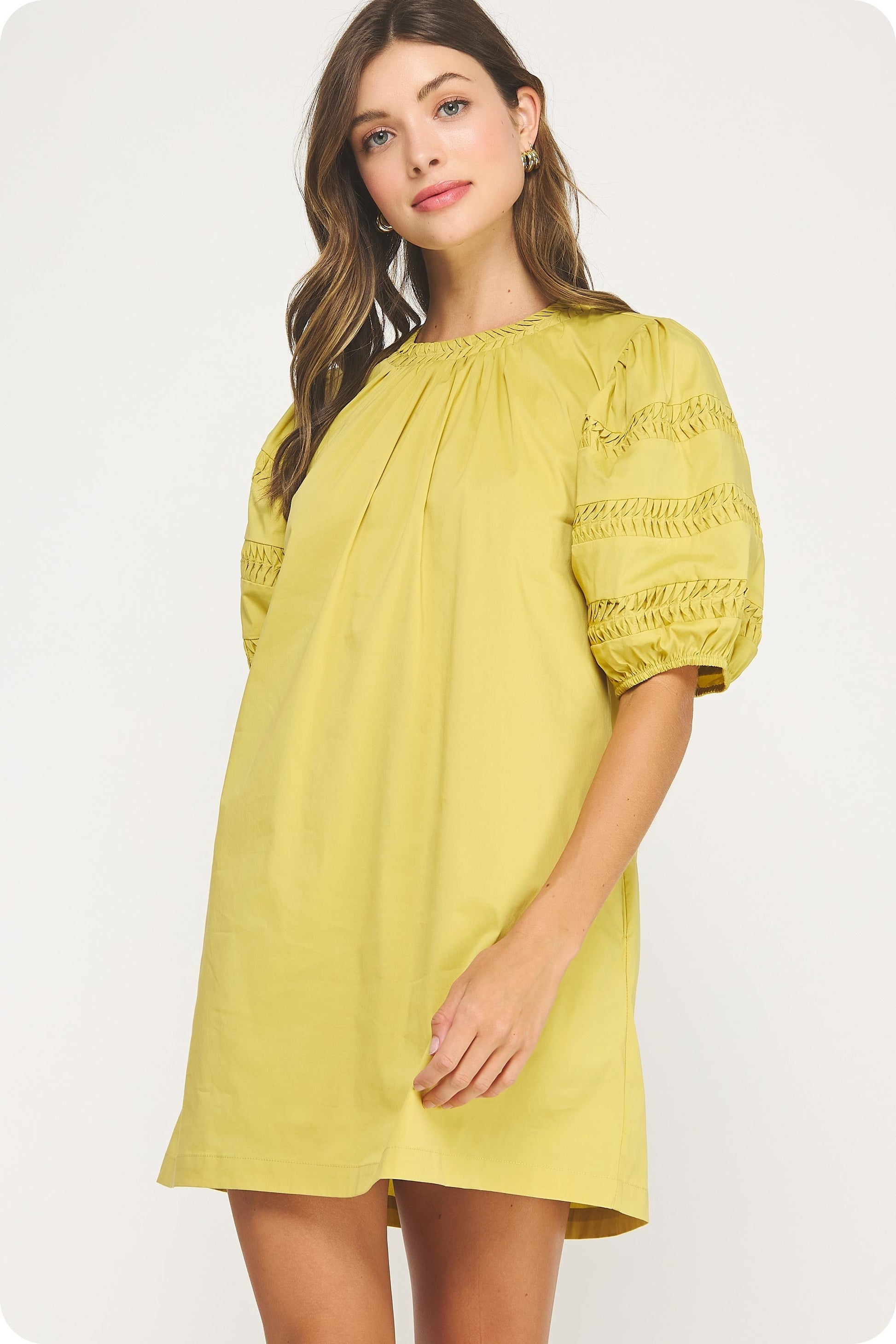 Bring the sunshine with you wherever you go in the Golden Hour Glow Dress. ☀️ With its statement puff sleeves detailed in breezy lace trim and its easy, relaxed silhouette, this dress is equal parts effortless and eye-catching. The bold golden hue makes it the ultimate confidence booster—perfect for bossing up your workday, dazzling at brunch, or making a statement at girls’ night. Just add bold earrings and a cute clutch, and you’re ready to shine like the CEO of color. ✨