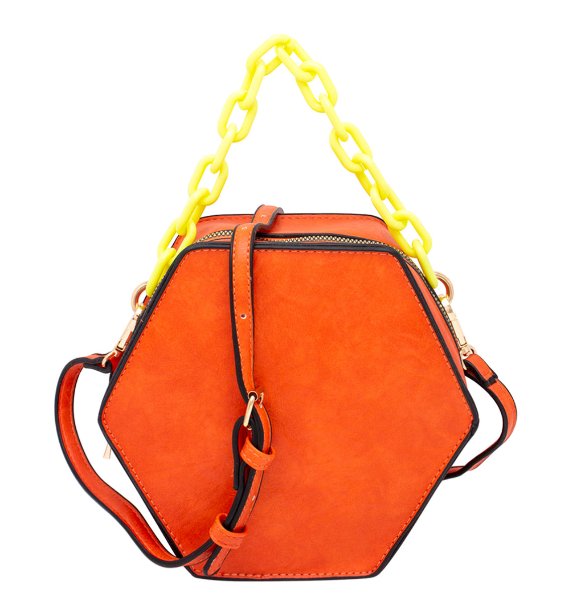 Expertly crafted for style and functionality, the Orange You Glad to See Me handbag features a striking hexagon shape and vibrant neon accents. Made with durable faux leather and a convenient crossbody strap, this purse is perfect for any on-the-go fashionista. Elevate your wardrobe with this must-have accessory.