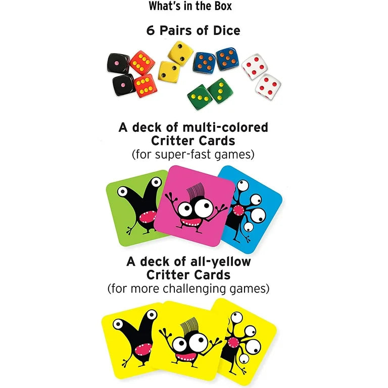 - INCLUDES: 60 multi-colored Critter Cards, 60 yellow Critter Cards for more challenging games, 6 pairs of dice, and instructions for fast-paced, family fun for 2 to 6 players ages 6 to 96.