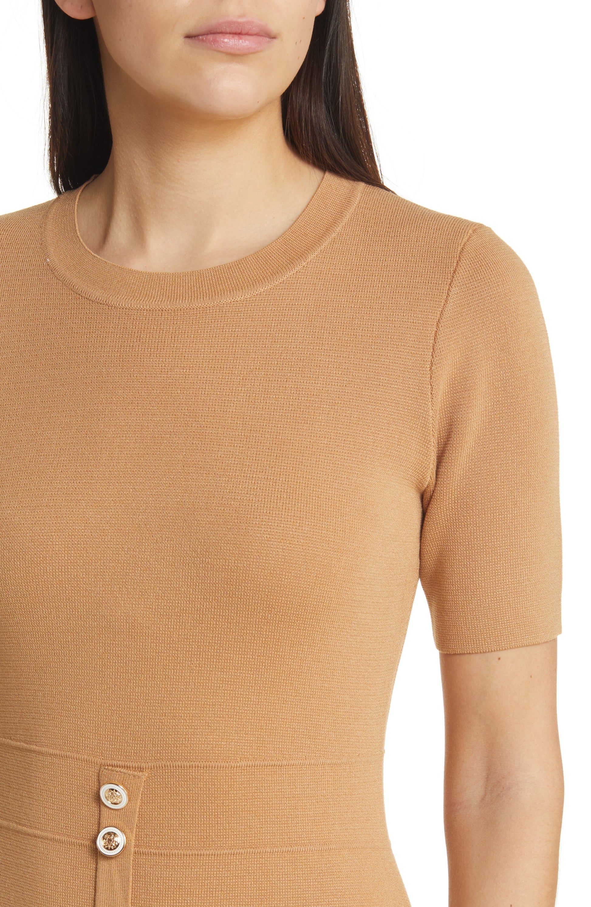 This sophisticated sweater-dress is knit in a longline silhouette with abbreviated sleeves and decorative buttons on the skirt. 47 1/2" length Slips on over head Crewneck Short sleeves 70% viscose, 30% polyester Hand wash, dry flat Imported